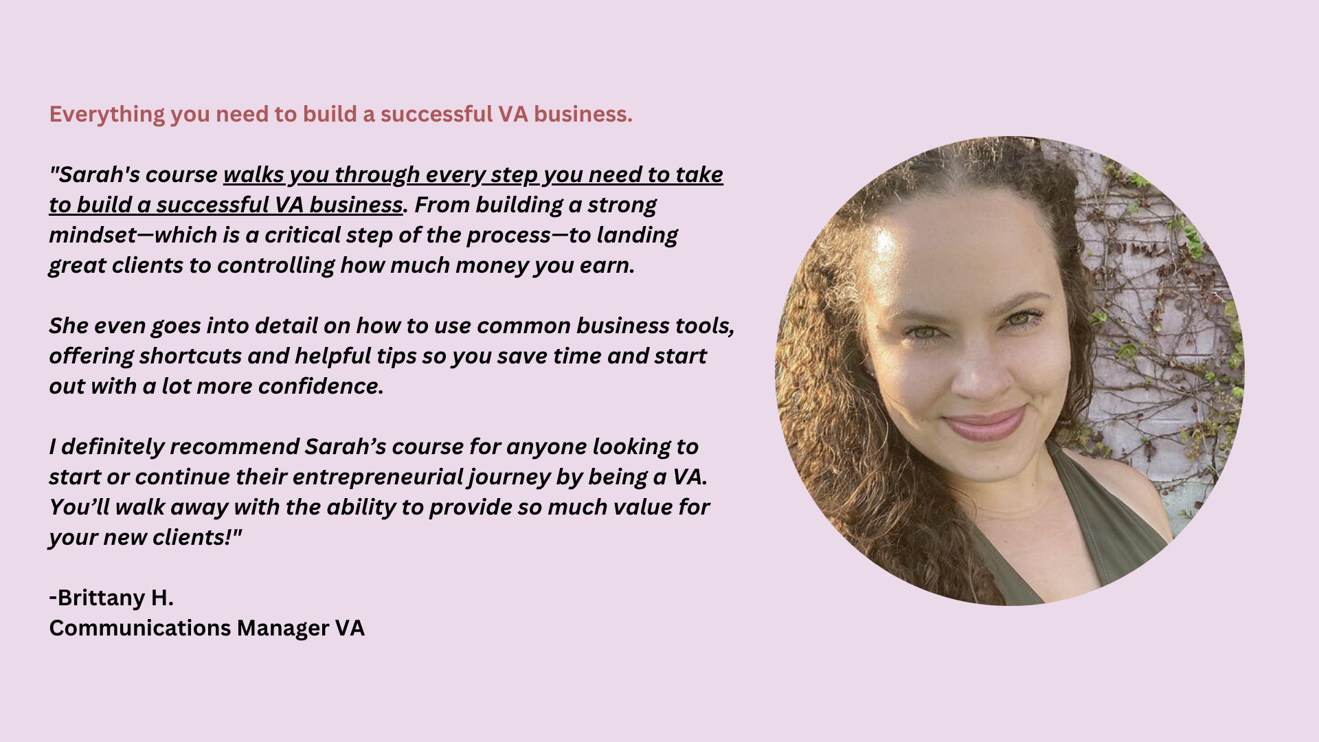 VA for Course Creators includes all the pieces you need to start your VA business from scratch, including a supportive community and course packed with video lessons you can listen to on your morning walk or while you’re driving.